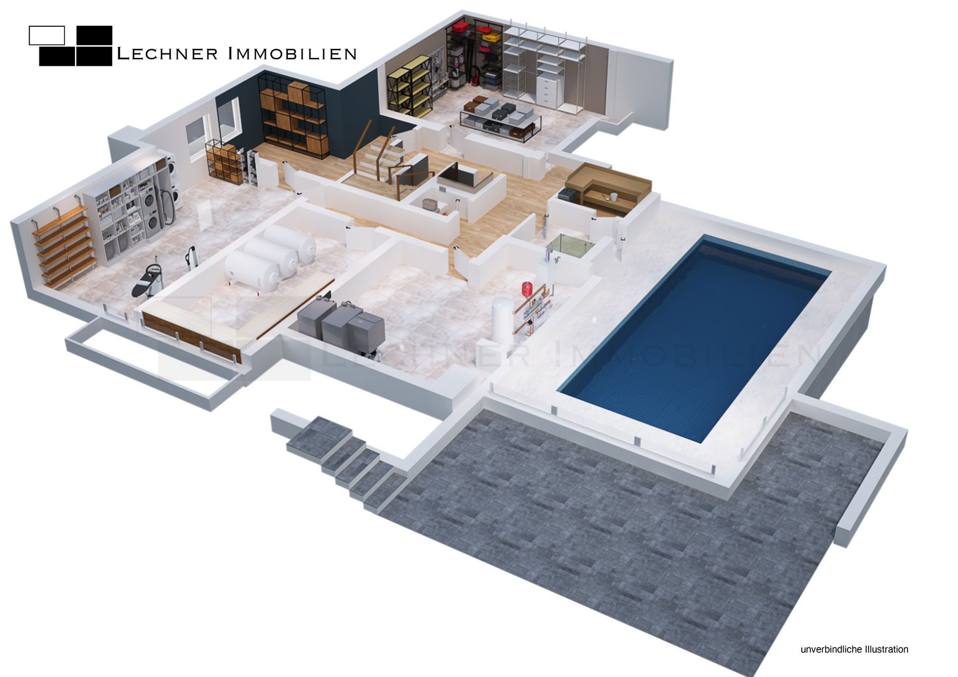 Für zusätzlichen Wohnkomfort sorgt ein Aufzug, der alle Etagen barrierefrei verbindet. Das gesamte Haus ist voll unterkellert und bietet neben mehreren Abstellräumen auch eine großzügige Waschküche. Eine besondere Attraktion ist der Indoor-Pool im Untergeschoss, der derzeit als Lounge genutzt wird und bei Bedarf reaktiviert werden kann.
