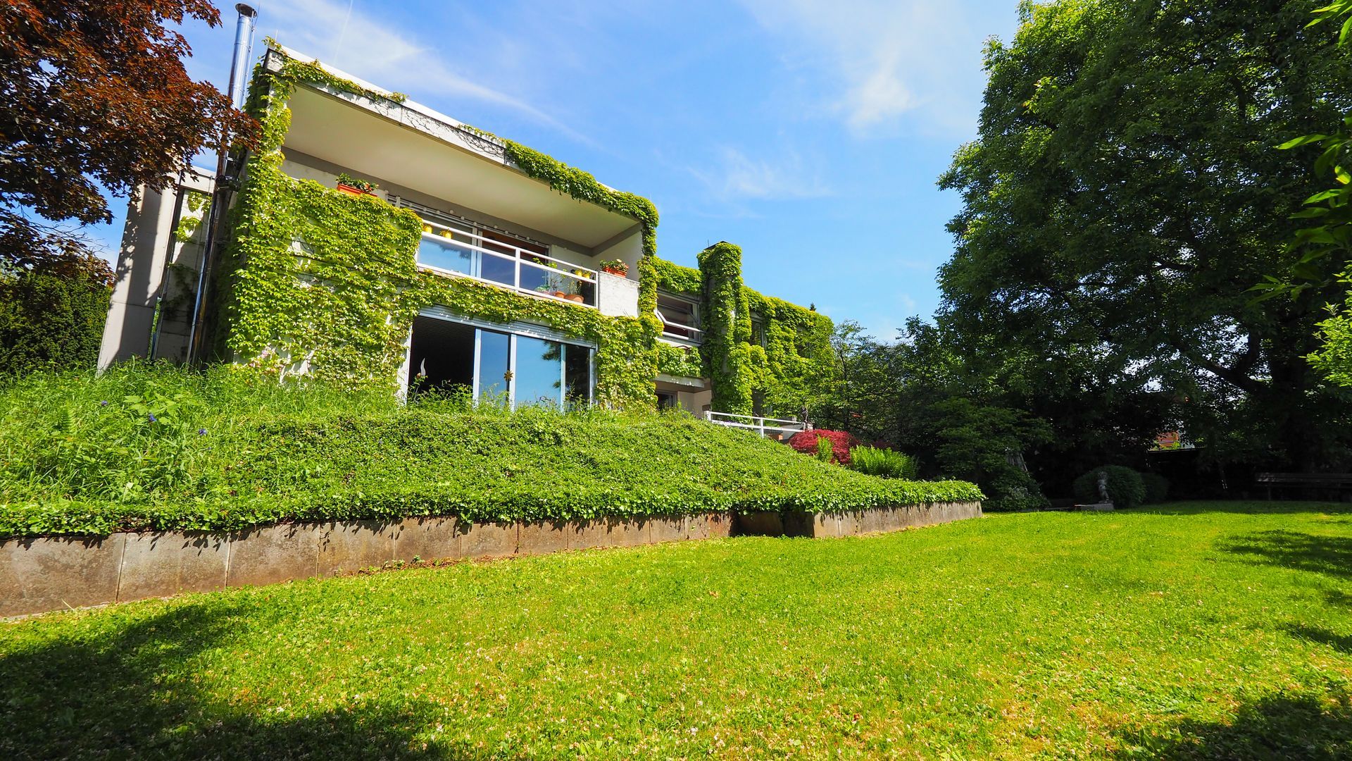 Die Besonderheit dieser Immobilie liegt ganz besonders in Ihrer Lage, der Außenanlage und dem hervorragenden Ausblick. Der parkähnliche Garten mit tollem Baumbestand schafft eine natürliche Barriere – für Privatsphäre auf höchstem Niveau.