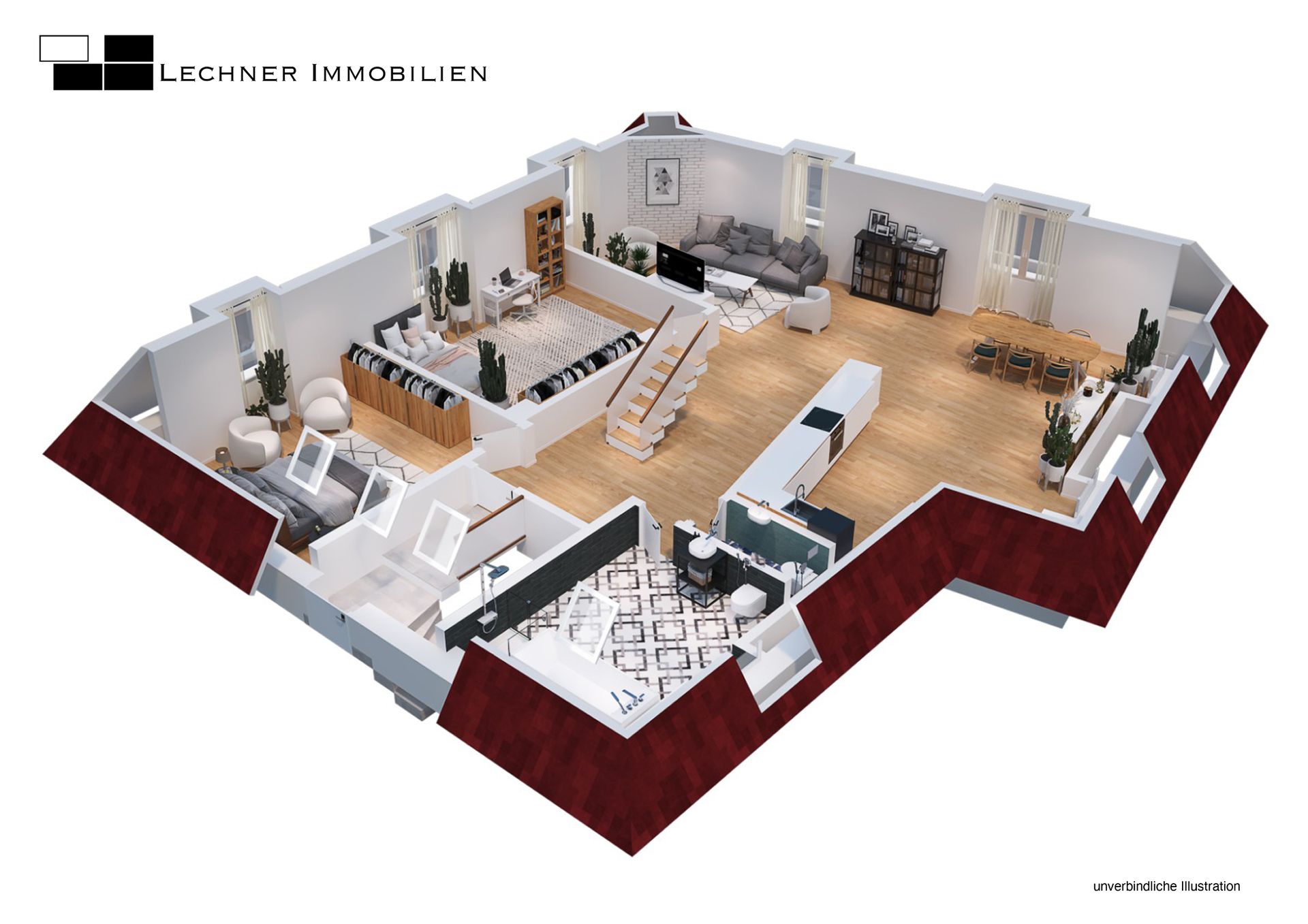 Die Erdgeschosswohnung (ca. 114 m²) bietet durch ihre Raumaufteilung und Nähe zum Garten ein ideales Zuhause für Paare oder kleine Familien. Im 1. und 2. Obergeschoss (jeweils ca. 121 m²) erstrecken sich lichtdurchflutete Wohnbereiche mit hohen Fenstern und klassischer Raumproportion. Das Dachgeschoss überzeugt als Maisonettewohnung mit rund 163 m² Wohnfläche und einem Atrium – ein echtes Highlight für alle, die offenes Wohnen mit besonderem Flair suchen.
