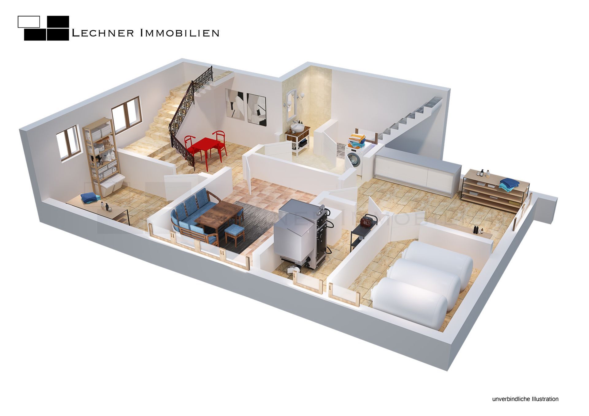 Der Keller des Hauses bietet reichlich Stauraum und verfügt über einen beheizten Hobbyraum. Ein tiefer Keller mit offenem Naturboden ergänzt die Stauflächen im Untergeschoss. An der Hausfront sorgen Glasbausteine für eine ansprechende Architektur.
