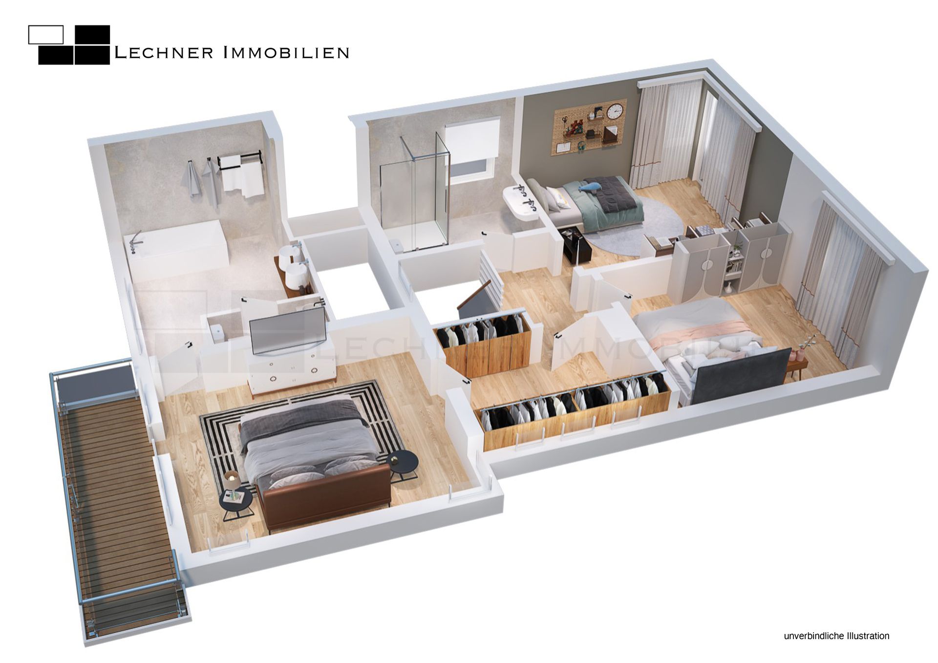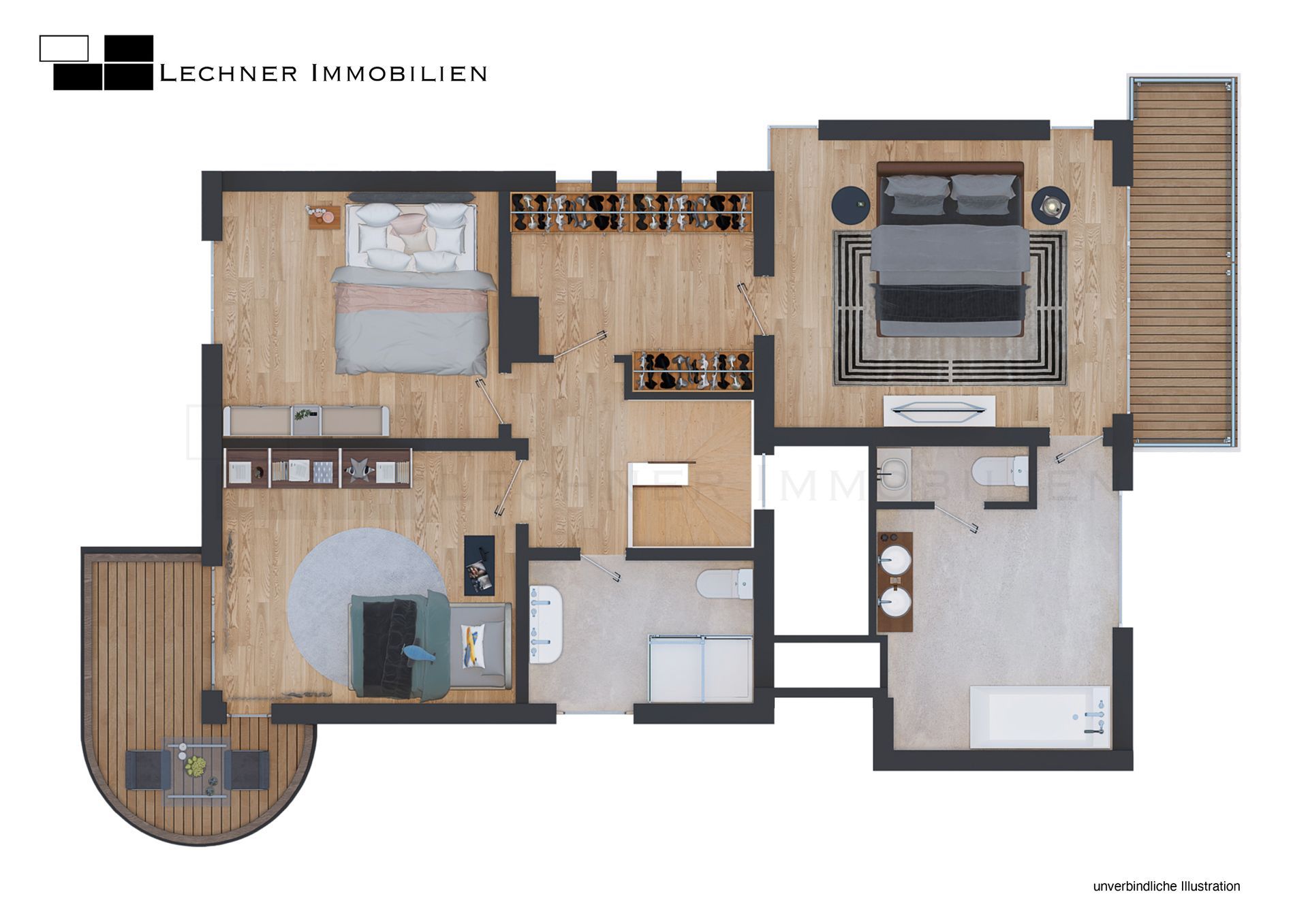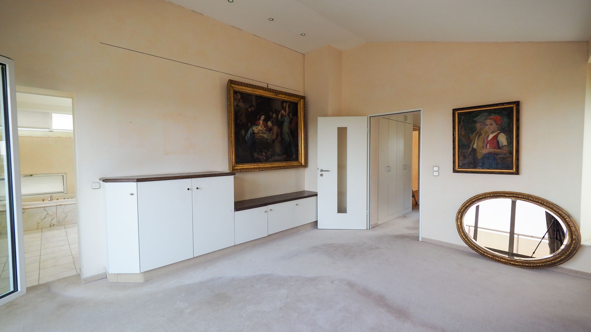 Im ursprünglichen Gebäudeteil finden sich klassische Elemente wie Holzkasettentüren mit stilgerechten Beschlägen, ein Dielenboden im Obergeschoss sowie eine Holztreppe, die mit Glaselementen zum Anbau überleitet. Vom Schlafzimmer aus gelangen Sie direkt auf den Balkon – ideal für den ersten Kaffee am Morgen. Zudem sind ein Badezimmer en Suite sowie eine Ankleide direkt angebunden.