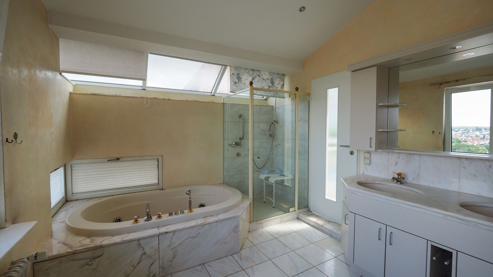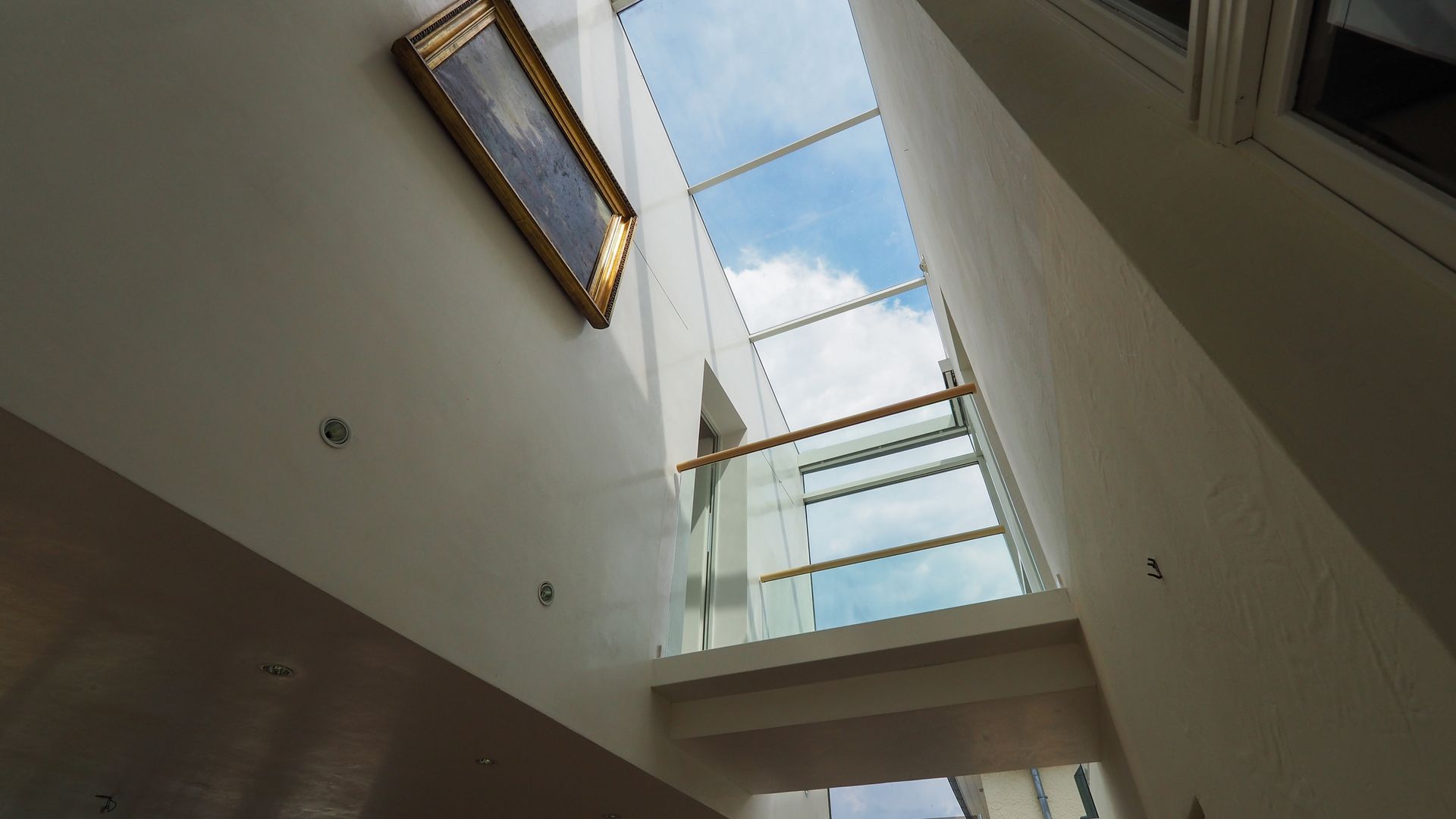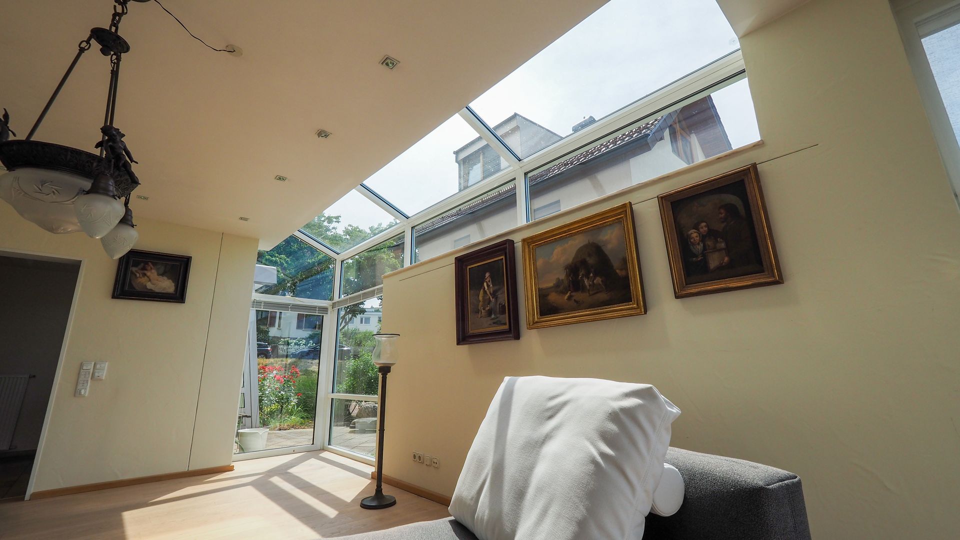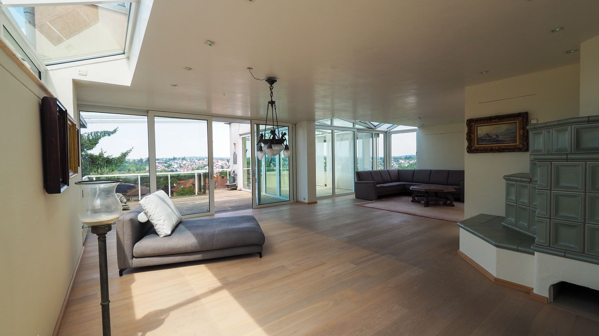 Der Ausblick ist jedoch nicht das einzige Merkmal, das dieses Haus besonders macht. Großzügige Fensterflächen durchziehen nahezu alle Wohnbereiche und schaffen eine angenehme Lichtstimmung im gesamten Haus. Eine deckenhohe Glasleiste bis unter den Giebel verbindet das ursprüngliche Gebäude aus dem Jahr 1927 mit dem Anbau von 1993. Im Zuge des Anbaus wurde auch der Altbestand saniert. Beide Gebäudeteile präsentieren sich heute in einem sehr gepflegten Zustand.
