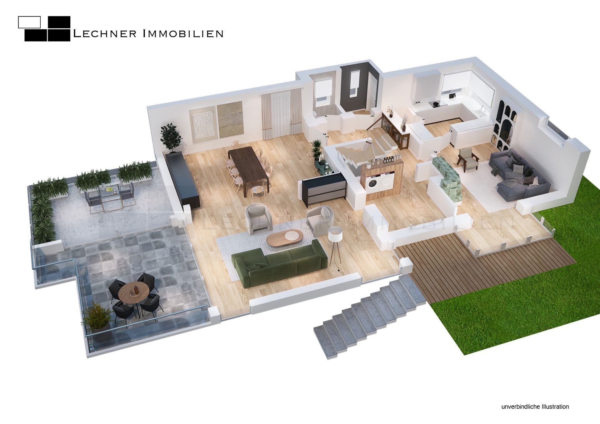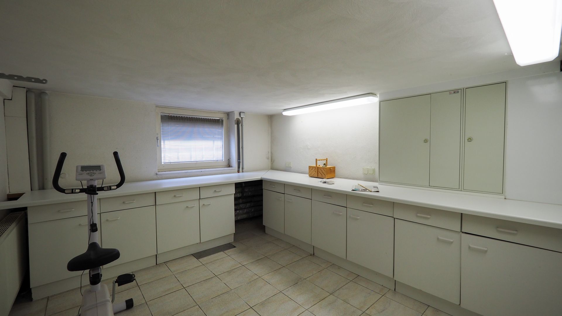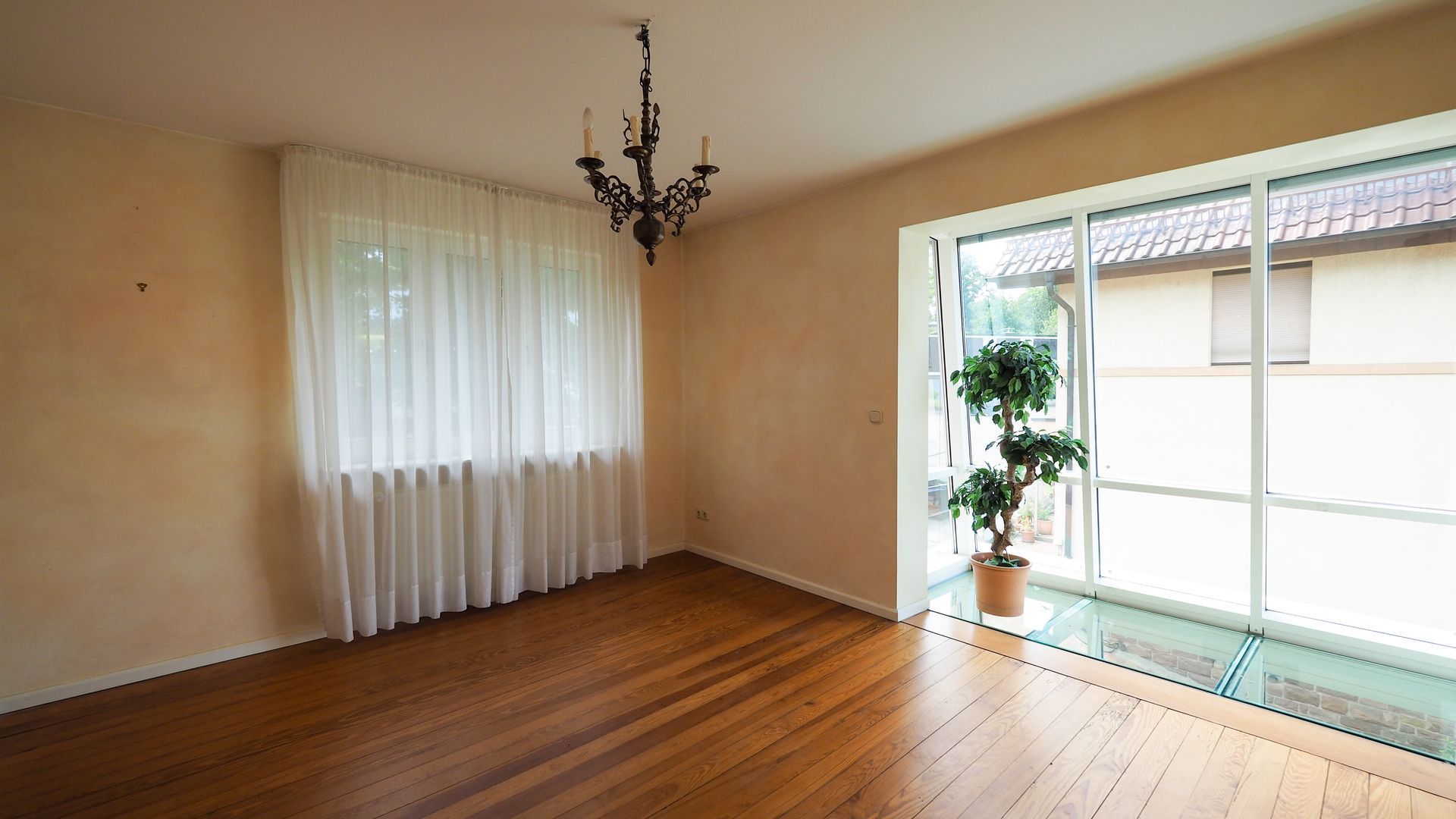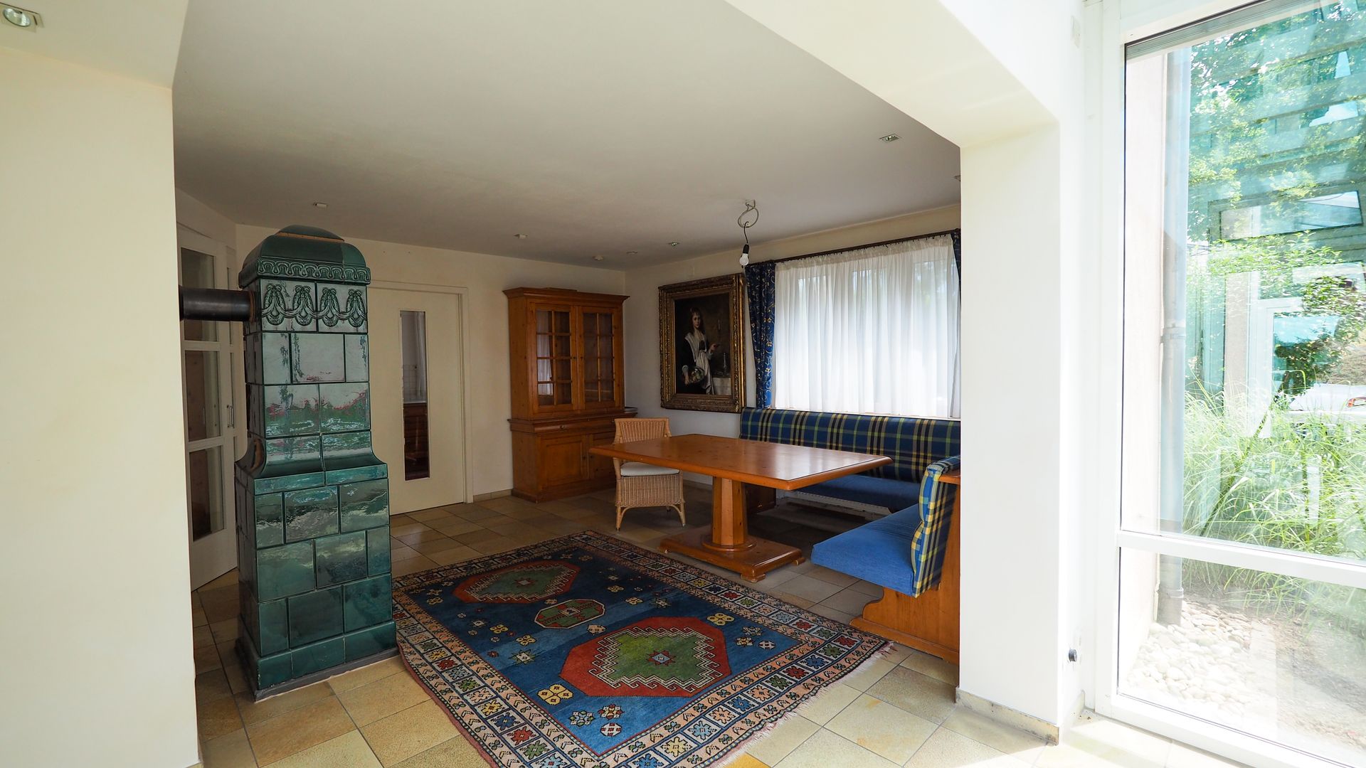 Der Wohnbereich überzeugt durch seine Großzügigkeit ebenso wie durch die Lichtführung. Die großflächige Verglasung eröffnet den Zugang zur Terrasse und zum Wintergarten. Der Essbereich mit Kaminofen schafft eine verbindende Atmosphäre für Alltag und Gäste. Die Küche ist abgeschlossen und mit einer älteren, funktionalen Einbauküche ausgestattet.