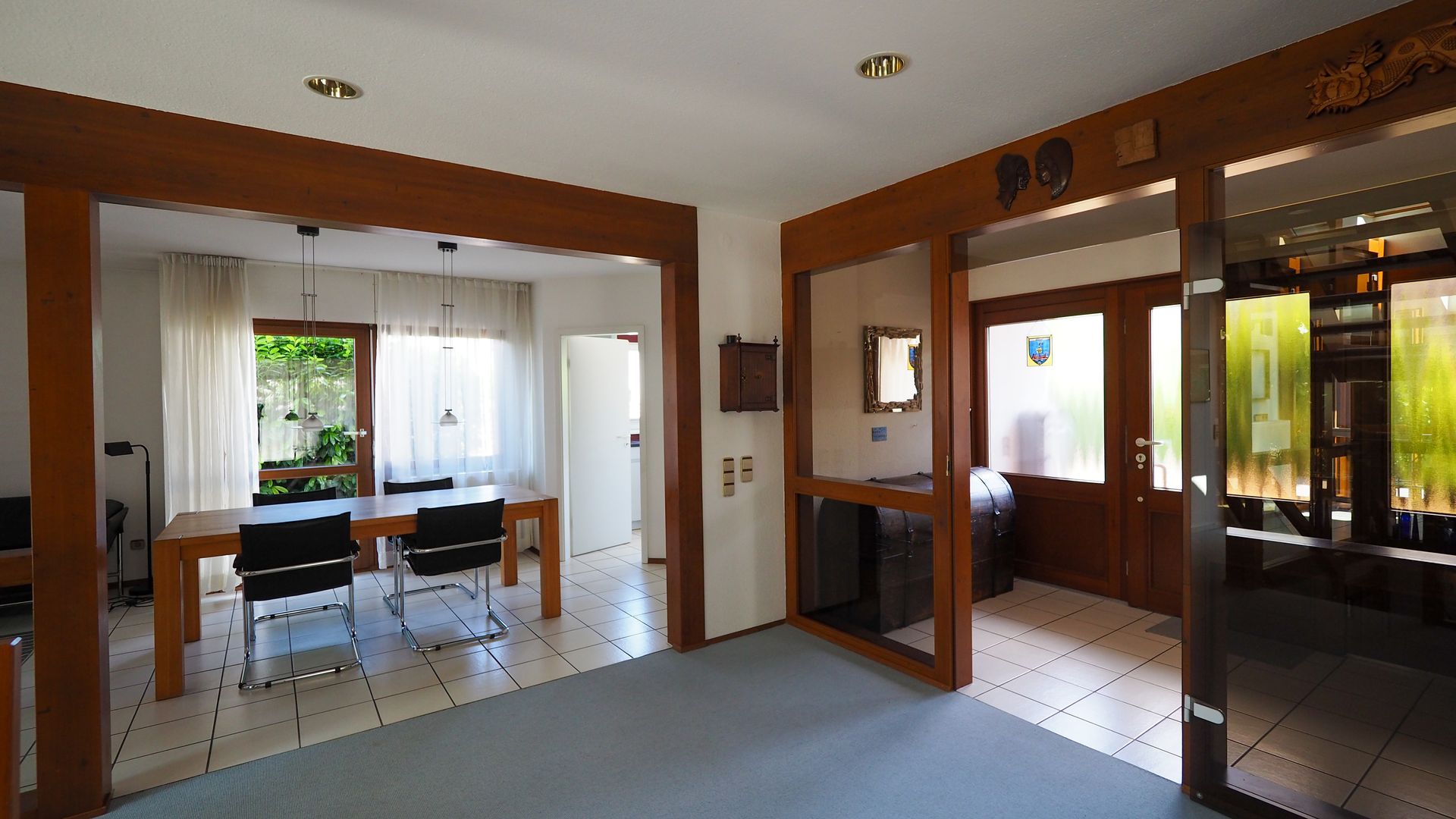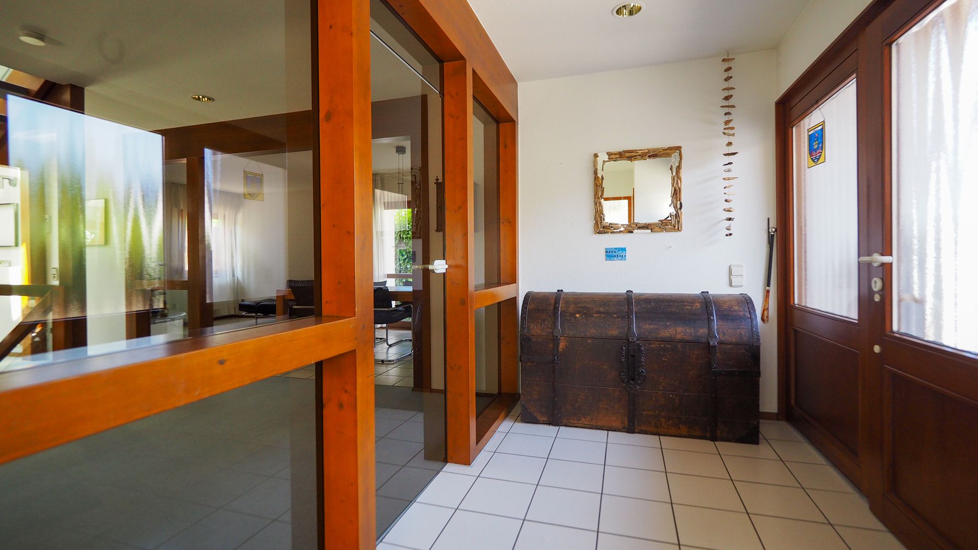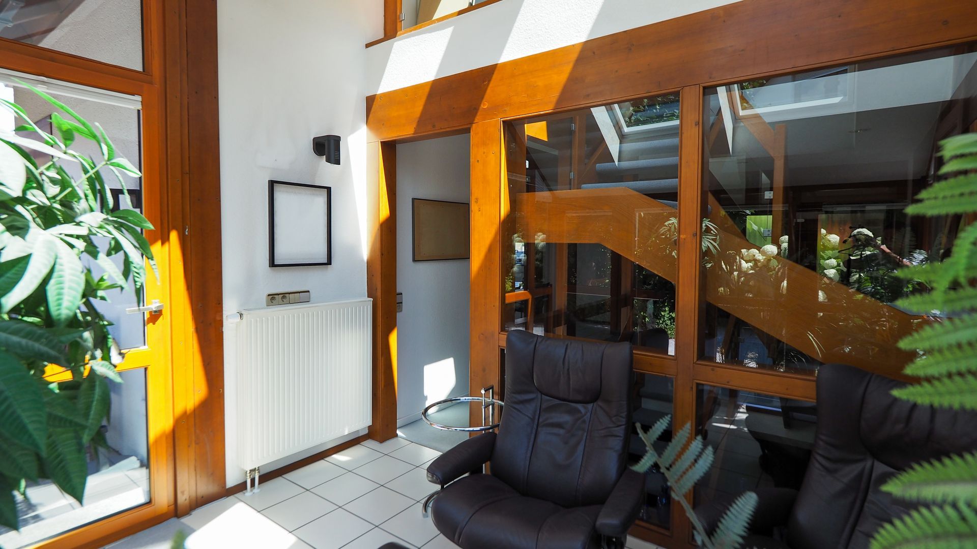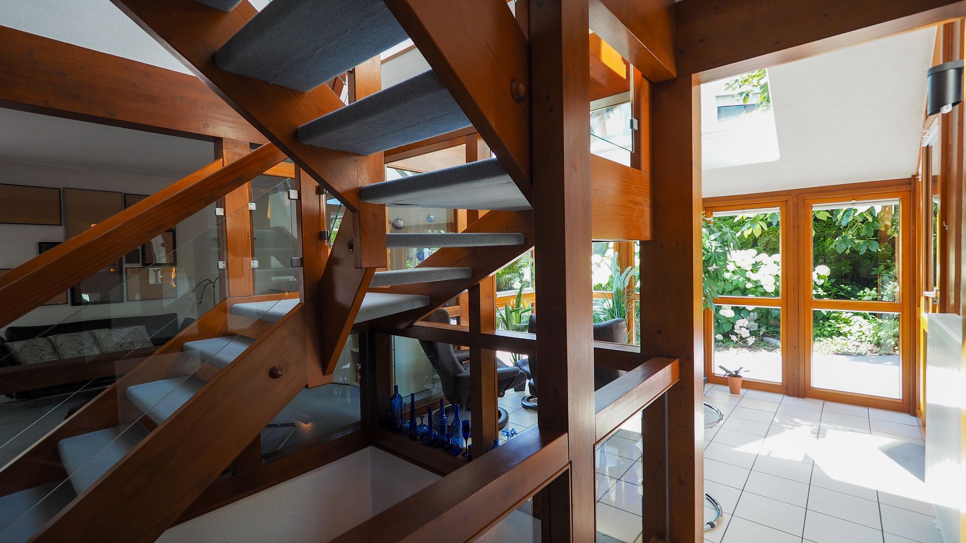 Hier erwartet Sie ein stilvolles Haus, dass sicher nicht für jedermann errichtet wurde - und das im positiven Sinne. Eine gelungene Mischung aus offenen und lichterfüllten Räumen und dem Schaffen von Privatsphäre. Im Erdgeschoss gelangen Sie zuerst in den Windfang, welcher durch eine Glastür zum Wohnbereich getrennt ist. Hier befindet sich die geräumige Garderobe und das Gäste-WC mit Tageslicht sowie das kleine Büro/Gästezimmer mit ca. 7,5 m². Der Wohnbereich ist offen und einladend und integriert das Treppenhaus mit Wohnzimmer, Essbereich und dem Wintergarten. Für Familien ergibt sich hier auch die Möglichkeit ein weiteres Schlafzimmer im jetztigen Wohnbereich zu schaffen.