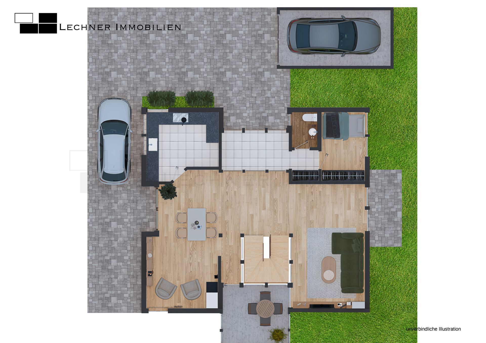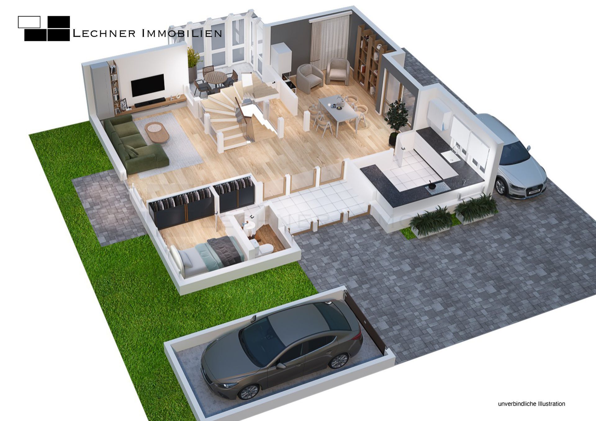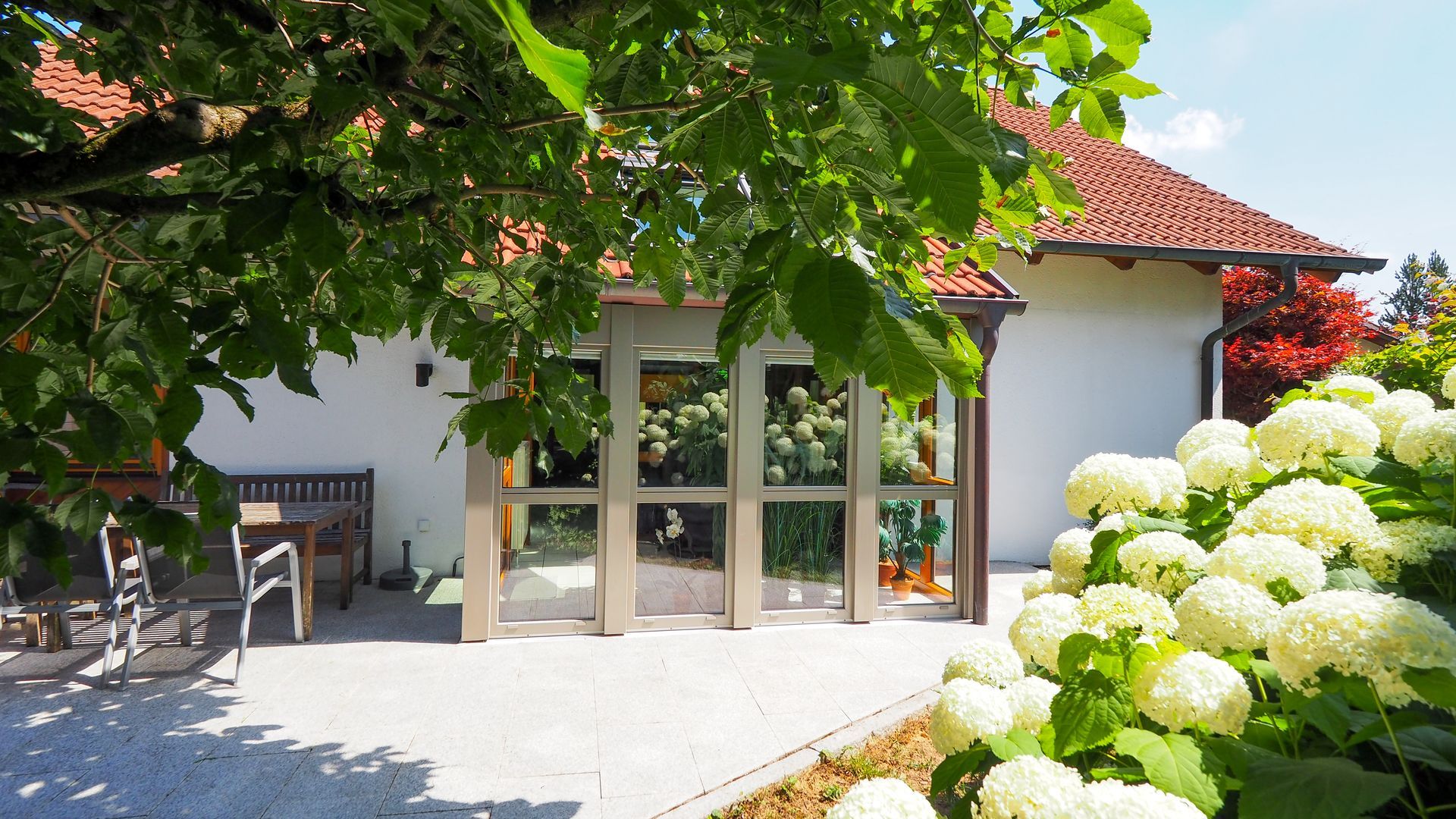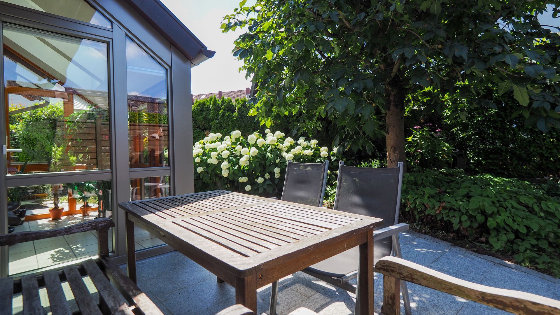 Hier erwartet Sie ein stilvolles Haus, dass sicher nicht für jedermann errichtet wurde - und das im positiven Sinne. Eine gelungene Mischung aus offenen und lichterfüllten Räumen und dem Schaffen von Privatsphäre. Im Erdgeschoss gelangen Sie zuerst in den Windfang, welcher durch eine Glastür zum Wohnbereich getrennt ist. Hier befindet sich die geräumige Garderobe und das Gäste-WC mit Tageslicht sowie das kleine Büro/Gästezimmer mit ca. 7,5 m². Der Wohnbereich ist offen und einladend und integriert das Treppenhaus mit Wohnzimmer, Essbereich und dem Wintergarten. Für Familien ergibt sich hier auch die Möglichkeit ein weiteres Schlafzimmer im jetztigen Wohnbereich zu schaffen.