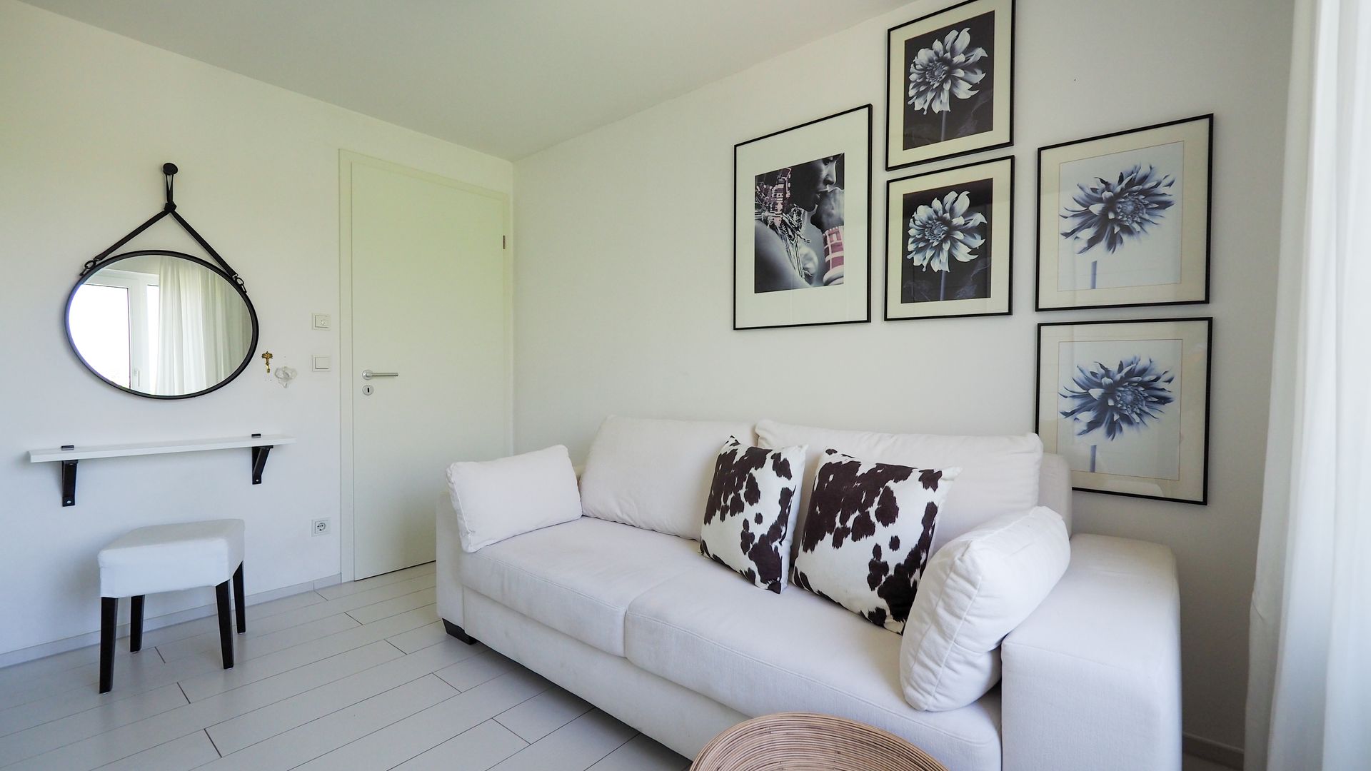 Der durchgehende Fliesenboden lässt die Wohnung hell und großzügig wirken und ist zudem pflegeleicht. Die Fußbodenheizung sorgt dafür, dass Sie auch bei kalten Temperaturen keine Hausschuhe benötigen. Die beiden Schlafzimmer sind von idealer Größe und bieten Platz für eine Familie mit Kind. Wenn Sie ein weiteres Schlafzimmer benötigen, kann der ursprüngliche Grundriss mit einer Trennwand im Wohnzimmer einfach wiederhergestellt werden.