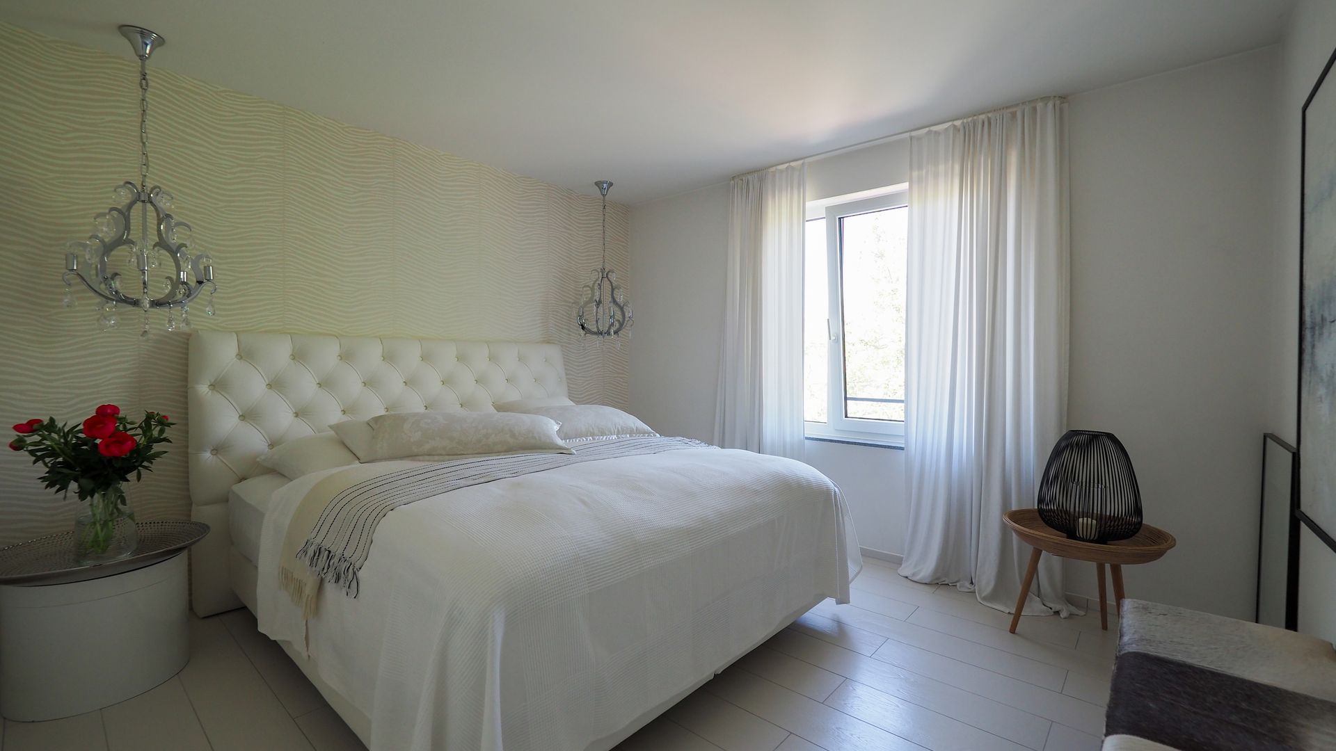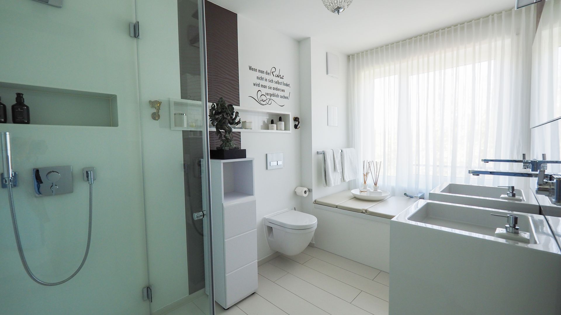 Das Tageslichtbad lädt Sie zum Entspannen ein. Egal, ob in der Badewanne oder in der bodentiefen Dusche – hier finden Sie Erholung und erleben vielleicht ein bisschen Wellness. Zwei Waschbecken, ein ausziehbarer Spiegelschrank sowie ein WC runden das Badezimmer ab. Im Gäste-WC wurden die Revisionsöffnungen für Elektrik und Fußbodenheizung geschickt versteckt, und der Einbauschrank im Flur bietet Platz für Garderobe und Dinge, die im Wohnraum das ruhige Ambiente stören würden.