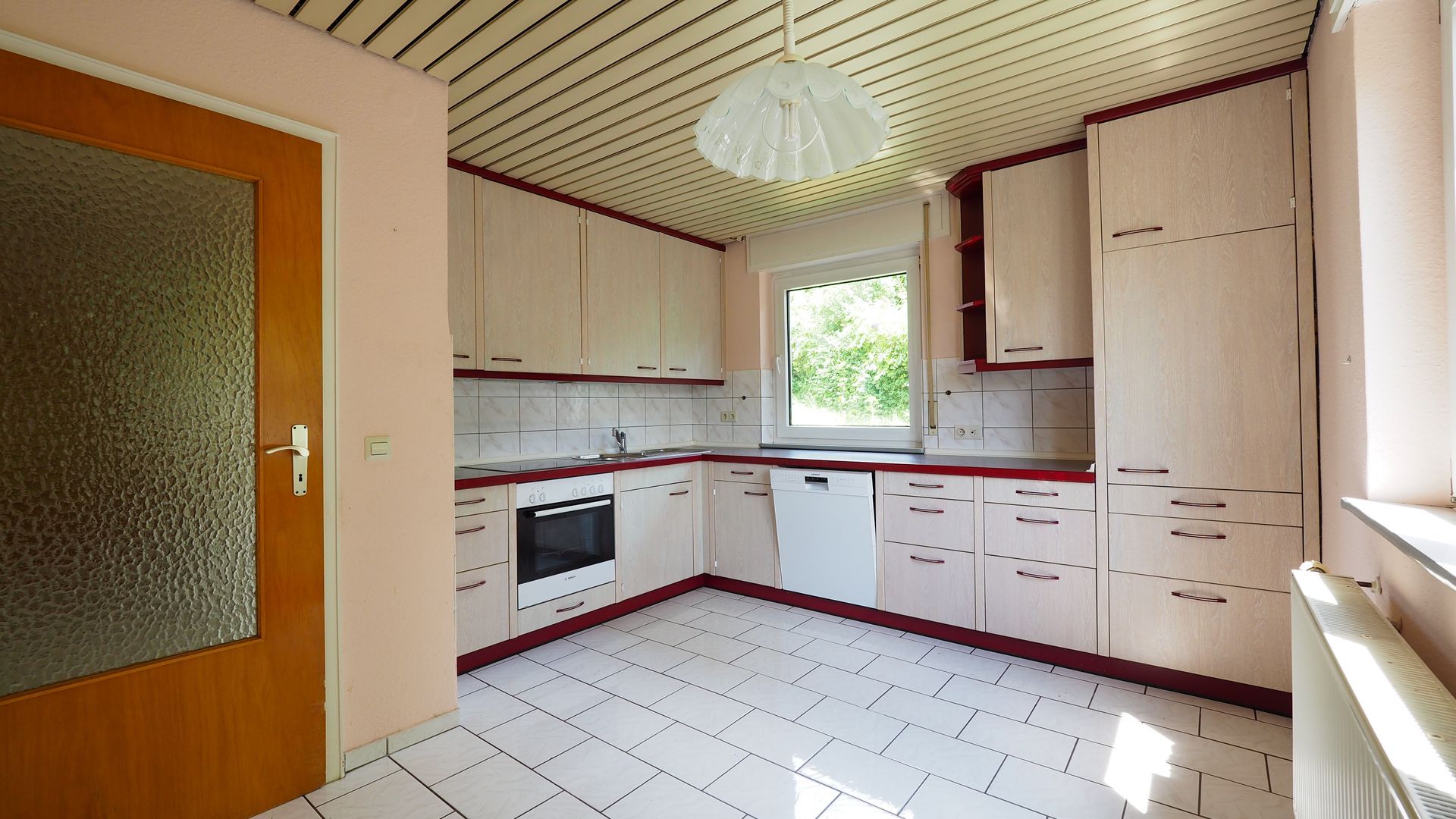 Das Erdgeschoss umfasst eine helle 2-3-Zimmer-Wohnung mit einem ca. im Jahr 2000 modernisierten Tageslichtbad. Die Wohnküche verfügt über eine ältere, aber funktionale Einbauküche, die viel Platz für kulinarische Kreationen bietet. Die großzügigen Fenster lassen viel Tageslicht in die Räume und schaffen eine einladende Atmosphäre.