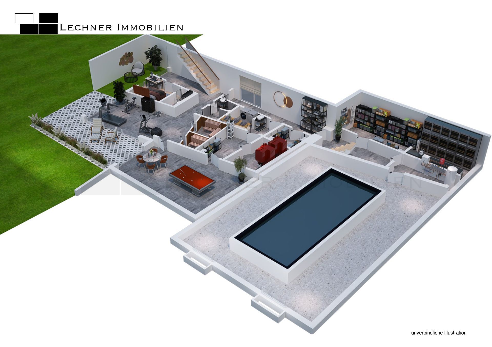 Mit acht großzügigen Garagenstellplätzen und einem Pool mit Gegenschwimmanlage wird diese Villa allen Anforderungen gerecht, sei es für Ihre Fahrzeugsammlung oder einfach, um Ihre Gäste zu beeindrucken.
