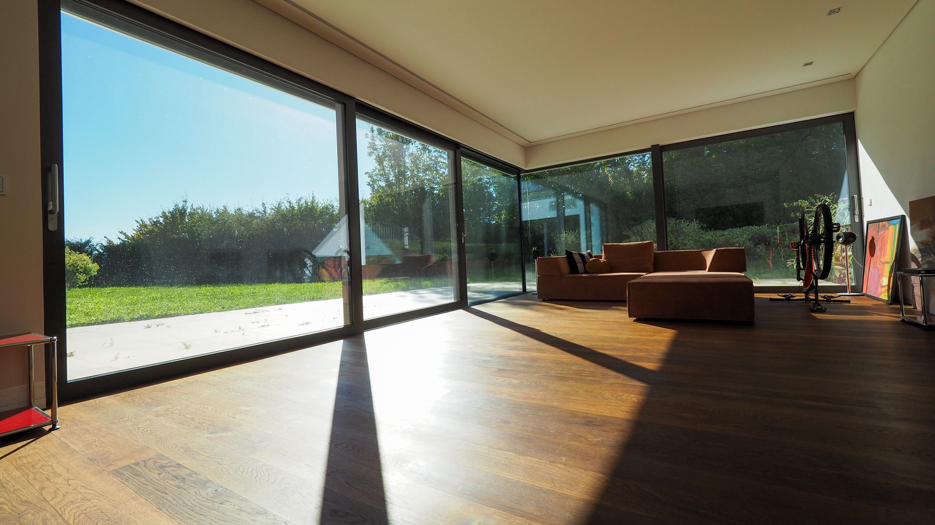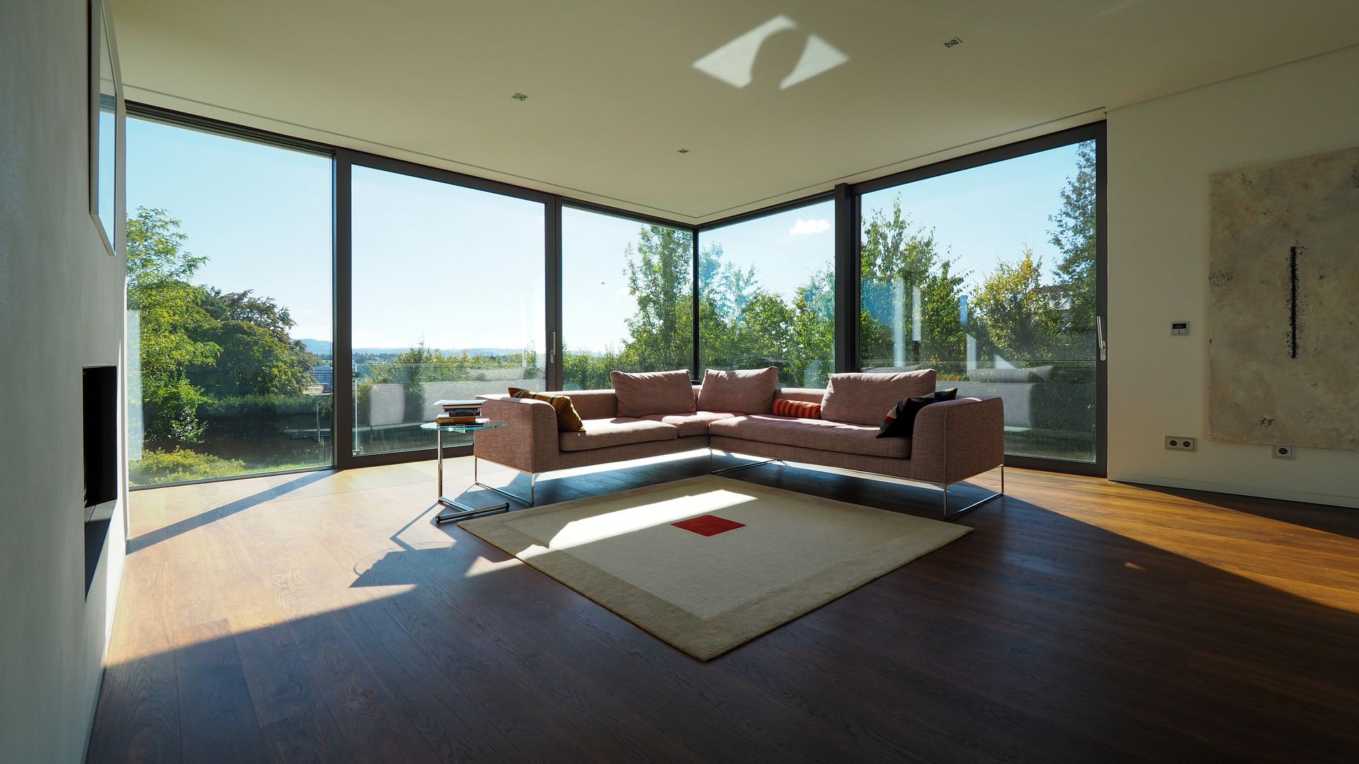 Der Wohnbereich ist durch einen Tunnelkamin mit dem Esszimmer verbunden und verfügt über bodentiefe Fensterflächen mit Schiebeelementen, die für ein lichtdurchflutetes und nahtloses Indoor-Outdoor-Erlebnis sorgen.